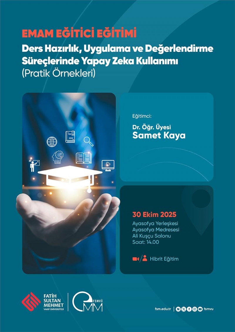 Eğitici Eğitimi serisi ilk eğitimi 30 Ekim 2025 tarihinde Dr. Öğr. Üyesi Samet Kaya tarafından "Ders hazırlık, uygulama ve değerlendirme süreçlerinde yapay zekâ kullanımı (pratik örnekleri)" başlığında gerçekleştirilmiştir. Katılımcılar LMS üzerinden eğitimle ilgili kısa sınava erişebilir ve tamamlayarak katılım belgelerini alabilirler.