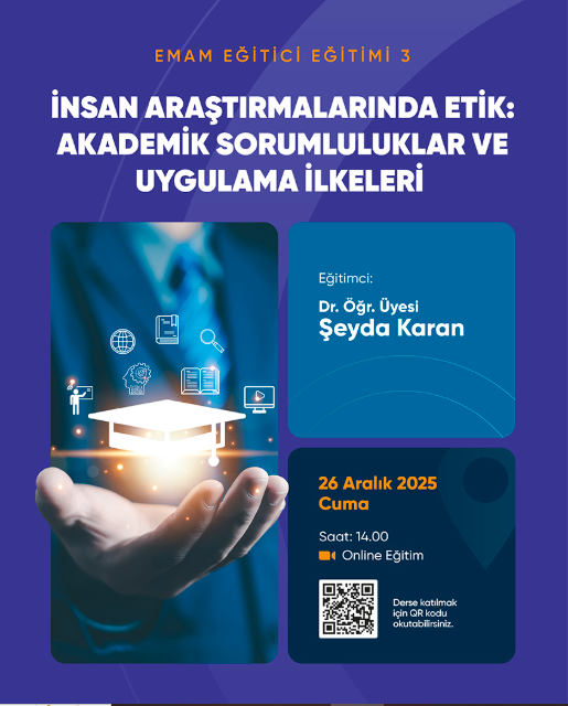 Eğitici Eğitimi serisinde, 26 Aralık 2025 tarihinde Dr. Öğr. Üyesi Şeyda KARAN tarafından "İnsan Araştırmalarında Etik: Akademik Sorumluluklar ve Uygulama İlkeleri" başlığında gerçekleştirilmiştir. Katılımcılar LMS üzerinden eğitimle ilgili kısa sınava erişebilir ve tamamlayarak katılım belgelerini alabilirler.