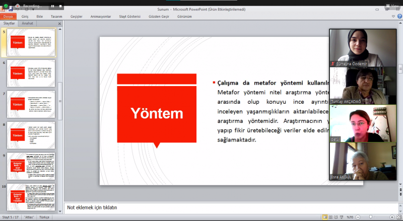 “Metodolojide Mükemmeli Yakalamak Ne Kadar Mümkün? Karma Yöntemler Araştırması” başlığında konuşan Dr. Sinem Toraman, son yıllarda farklı disiplinlerde ve alanlarda oldukça popülerlik kazanan karma yöntemler araştırmasının uygulanma amacı, eğitim araştırmalarındaki yeri ve bu metodolojinin araştırmacılara sağladığı avantajları ele aldı. Karma yöntemler araştırmasına ilişkin soru ve sorunlara değinerek katılımcılara bu metodolojiyi en iyi şekilde kullanmaya ilişkin öneriler sundu.